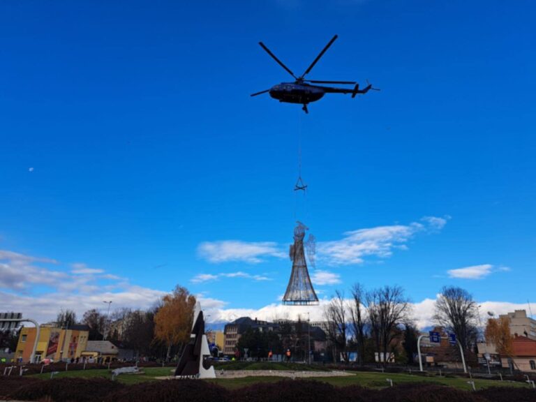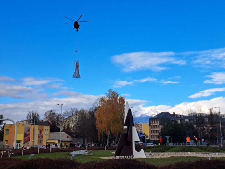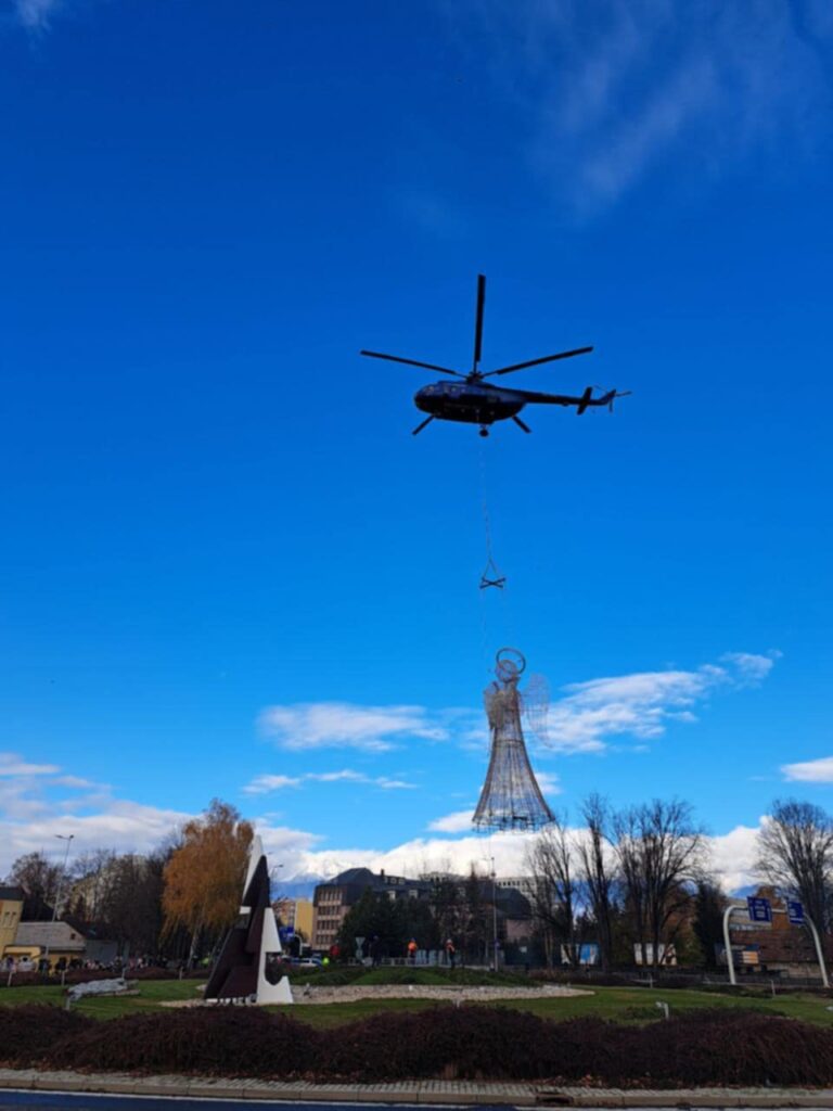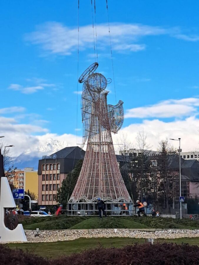 Veľký kruhový objazd v centre Popradu už zdobí trinásťmetrový anjel. Foto: SITA/Mária Frisová