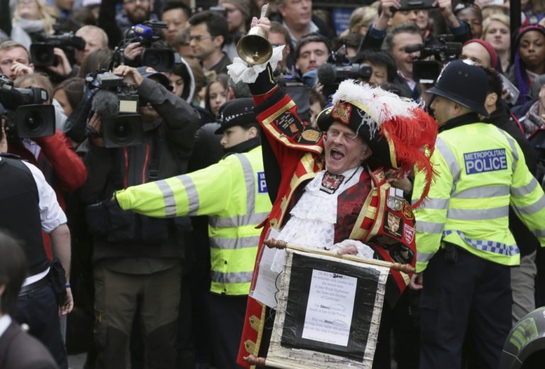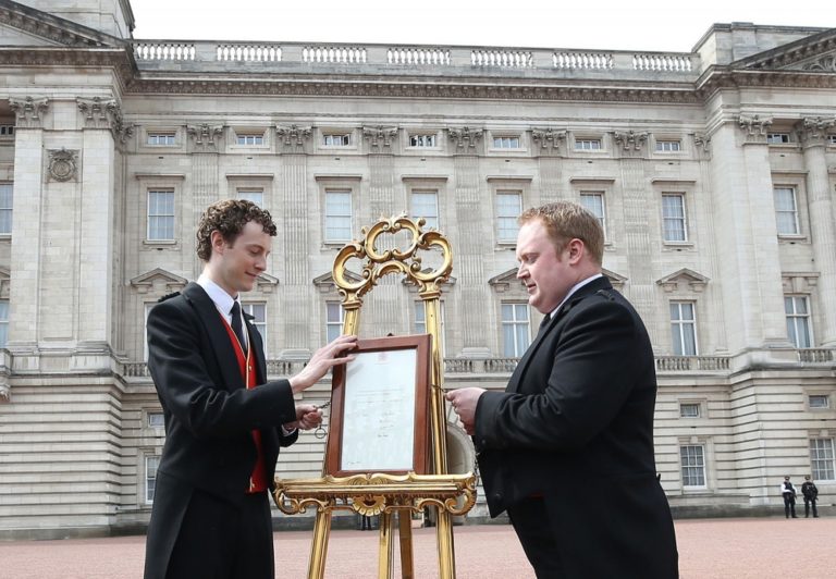 Oznam o narodení dievčatka pred Buckinghamským palácom. Bábätko prišlo na svet v sobotu 2. mája o 8:34 miestneho času a po narodení vážilo približne 3700 gramov. Foto: SITA/AP