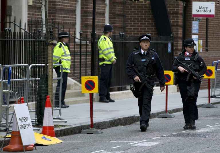 Britská polícia strážila okolie londýnskej St. Mary's Hospital, kde vojvodkyňa Catherine priviedla na svet dcéru, ktorá vážila približne 3700 gramov. Foto: SITA/AP