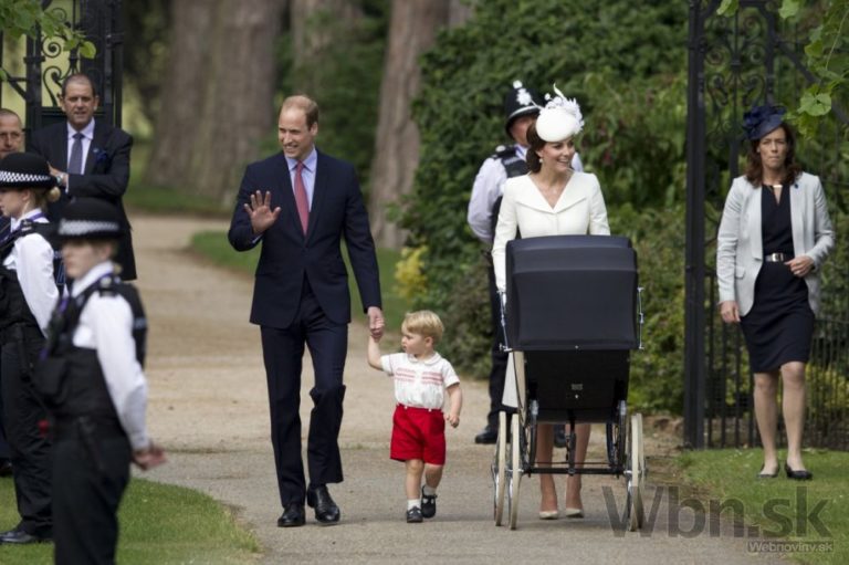 Princeznú Charlotte, ktorá sa 2. mája narodila britskému kráľovskému páru vojvodovi a vojvodkyni z Cambridgeu, v nedeľu pokrstili v kostole svätej Márie Magdalény v Sandringhame v grófstve Norfolk. Jej krstnými rodičmi sa stala kamarátka princa Williama a jeho manželky Catherine Sophie Carter, Williamova sesternica Laura Fellowes a jeho kamaráti James Meade a Thomas van Straubenzee a tiež Catherinin bratranec Adam Middleton. Na fotografii: Vojvoda a vojvodkyňa s Cambridgeu spolu s princom Georgeom. Anglicko, 5. júla 2015. Foto: SITA/AP