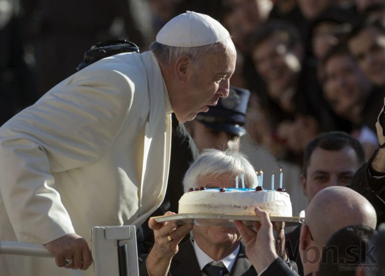 Pápež František sfukuje sviečku na narodeninovej torte na Námestí sv. Petra. Foto: SITA