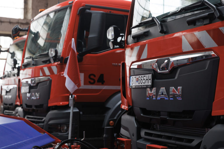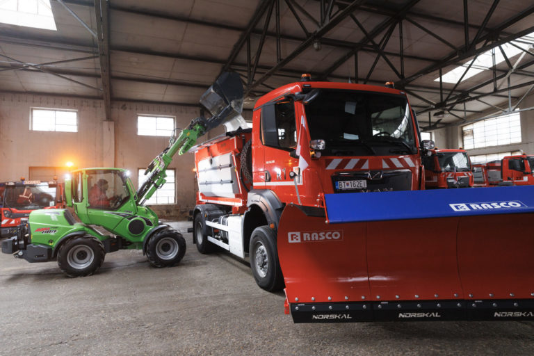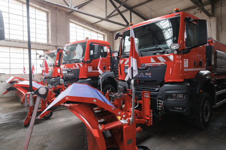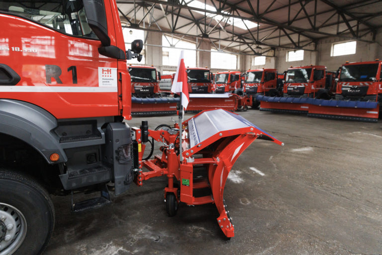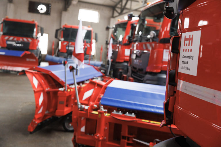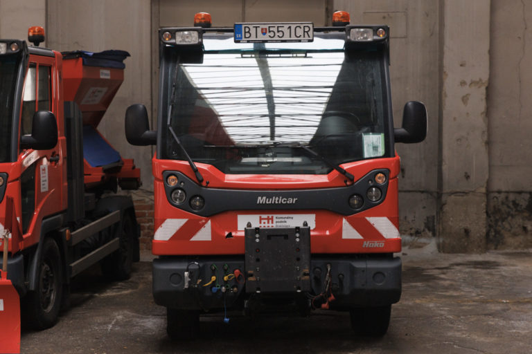 Multifinkčné vozidlá pripravené na zimnú údržbu v priestoroch Komunálneho podniku Bratislava na Bazovej ulici. Bratislava, 15. december 2022. Foto: SITA/Branislav Bibel