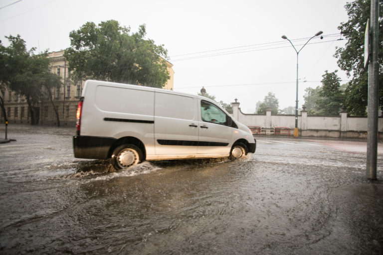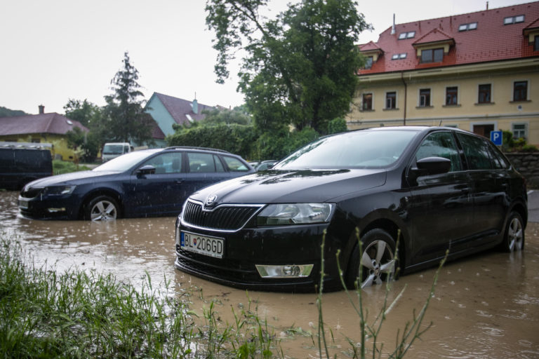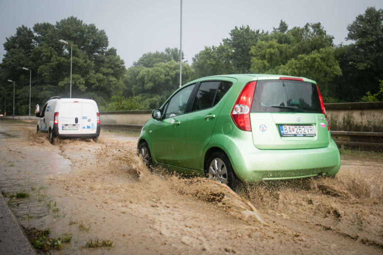 Pohľad na zatopené parkovisko v MČ Bratislava Devín v dôsledku silnej búrky sprevádzanej hustým dažďom v hlavnom meste. Bratislava, 6. jún 2018. Foto: SITA/Jana Birošová
