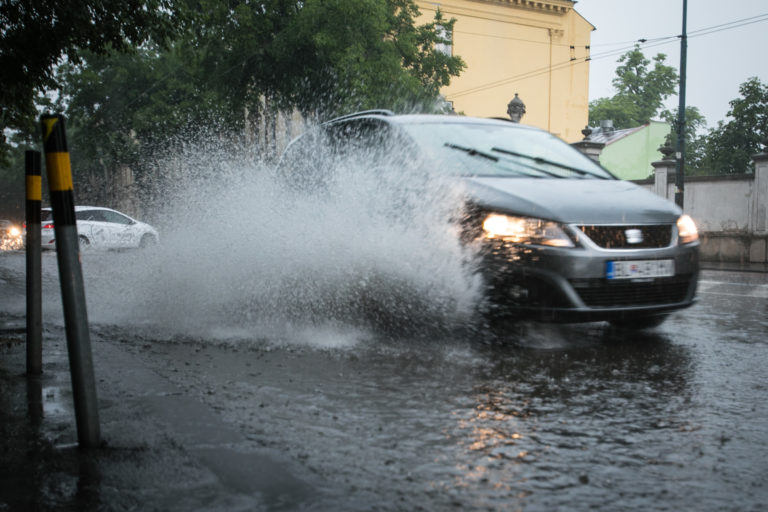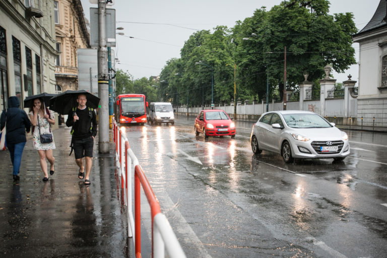 Pohľad na zatopenú cestu na Štefánikovej ulici v dôsledku silnej búrky sprevádzanej hustým dažďom v hlavom meste. Bratislava, 6. jún 2018. Foto: SITA/Jana Birošová