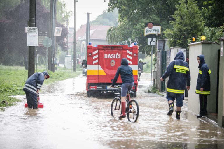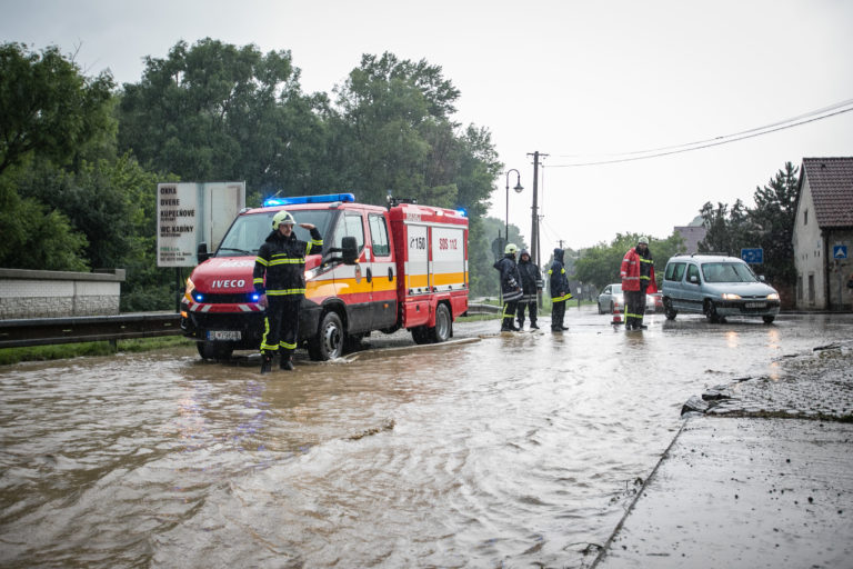 Hasiči na ceste v MČ Bratislava Devín, ktorú zatopilo v dôsledku silnej búrky sprevádzanej hustým dažďom v hlavnom meste. Bratislava, 6. jún 2018. Foto: SITA/Jana Birošová