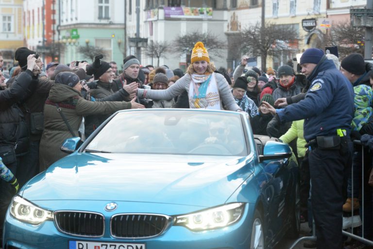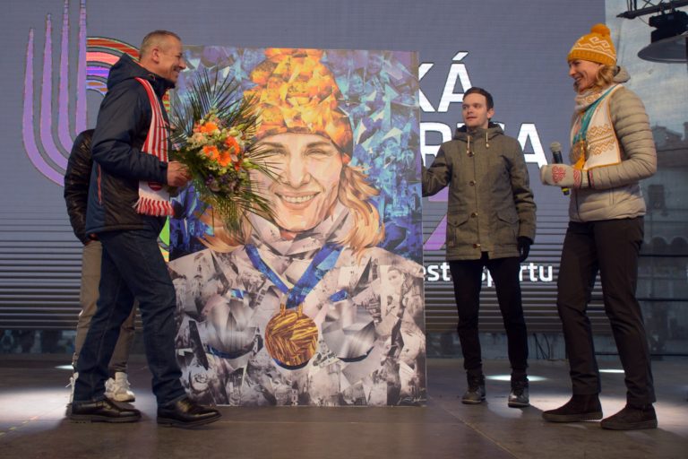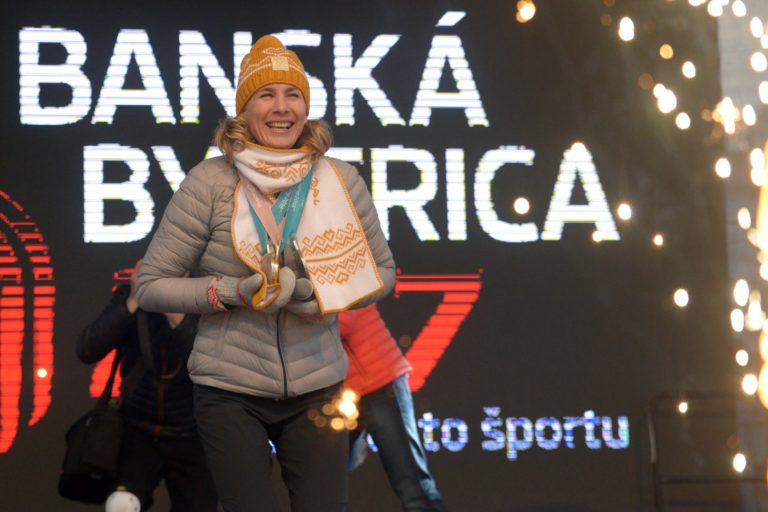 Biatlonistka, zlatá medailistka a dvojnásobná strieborná medailistka zo ZOH 2018 v Pjongčangu Anastasia Kuzminová počas svojho slávnostného privítania na Námestí SNP v Banskej Bystrici. Banská Bystrica, 1. marec 2018 Foto: SITA/Jakub Julény