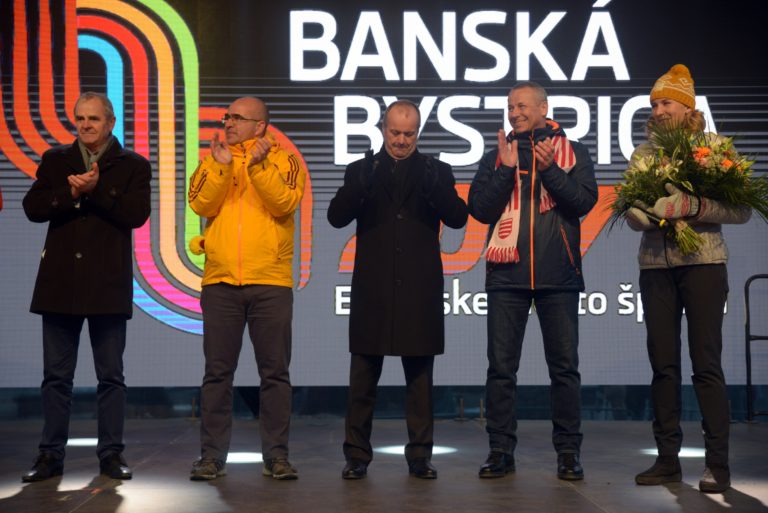 Biatlonistka, zlatá medailistka a dvojnásobná strieborná medailistka zo ZOH 2018 v Pjongčangu Anastasia Kuzminová (vpravo) a primátor mesta Banská Bystrica Ján Nosko (vľavo) počas slávnostného privítania na Námestí SNP v Banskej Bystrici. Banská Bystrica, 1. marec 2018 Foto: SITA/Jakub Julény