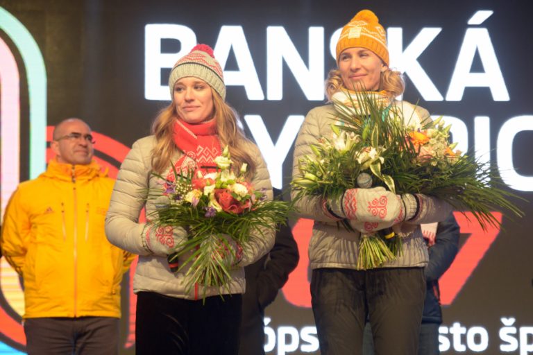 Zľava v popredí: Slovenská biatlonistka Pavlína Fialková a biatlonistka, zlatá medailistka a dvojnásobná strieborná medailistka zo ZOH 2018 v Pjongčangu Anastasia Kuzminová počas svojho slávnostného privítania na Námestí SNP v Banskej Bystrici. Banská Bystrica, 1. marec 2018 Foto: SITA/Jakub Julény