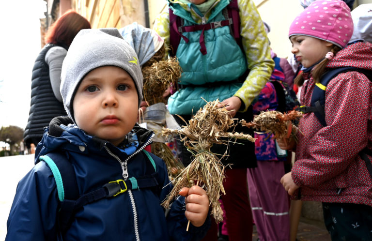 Najmenší zhotovitelia Moreny počas 68. ročníka Privítania jari v Prešove, ktorého súčasťou bol sprievod k rieke Torysa a následne symbolické pálenie Moreny. Podujatie pripravil klub slovenských turistov regiónu Prešov, Olympijský klub Prešov, OZ Šariš Lesy SR a Mestom Prešov. Prešov, 24. marec 2024. Foto: SITA/Viktor Zamborský