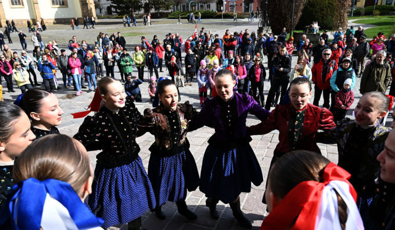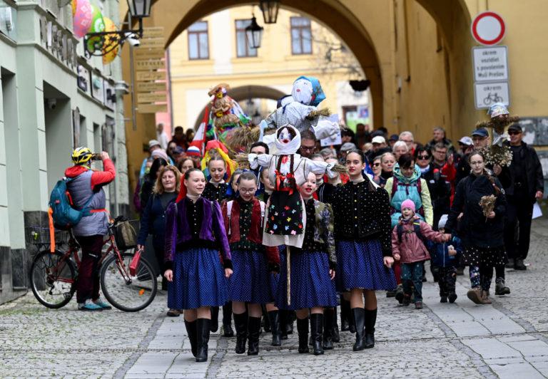 Ľudový súbor z Hermanoviec počas vystúpenia v rámci 68. ročníka Privítania jari v Prešove, ktorého súčasťou bol sprievod k rieke Torysa a následne symbolické pálenie Moreny. Podujatie pripravil klub slovenských turistov regiónu Prešov, Olympijský klub Prešov, OZ Šariš Lesy SR a mestom Prešov. Prešov, 24. marec 2024. Foto: SITA/Viktor Zamborský