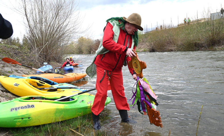 Vodník Zolly odomyká hladinu rieky Torysa počas otvorenia sezóny pre vodákov v rámci 68. ročníka Privítania jari organizovaného Klubom slovenských turistov regiónu Prešov, Olympijským klubo Prešov, OZ Šariš Lesy SR a Mestom Prešov. Súčasťou podujatia bol sprievod k rieke Torysa a následne symbolické pálenie Moreny. Prešov 24. marec 2024. Foto: SITA/Viktor Zamborský