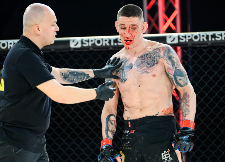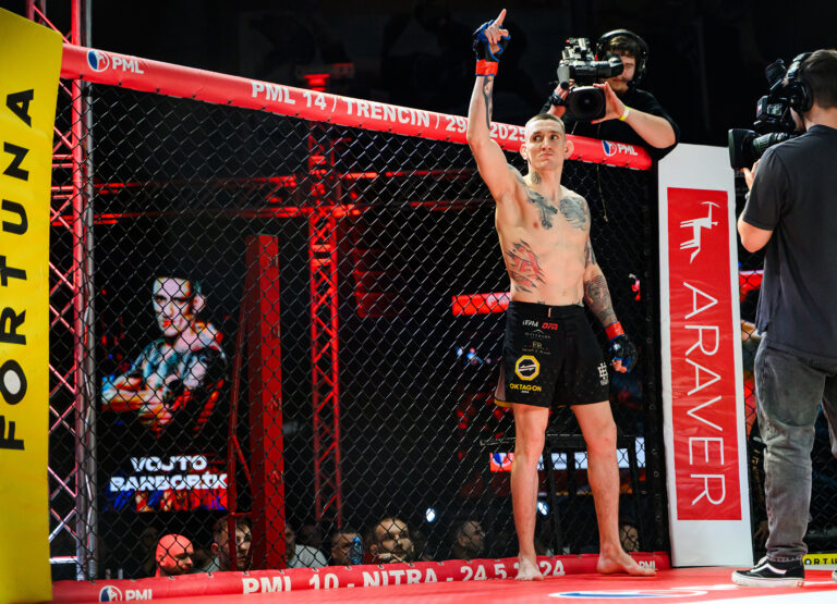 Vojto Barborík zo Slovenska z kategórie MMA - 70kg počas turnaja zmiešaného bojového umenia MMA a bojového umenia Muaythai - Professional Muaythai League 13 v Hlohovci. Hlohovec, 25. január 2025. Foto: SITA/Martin Havran