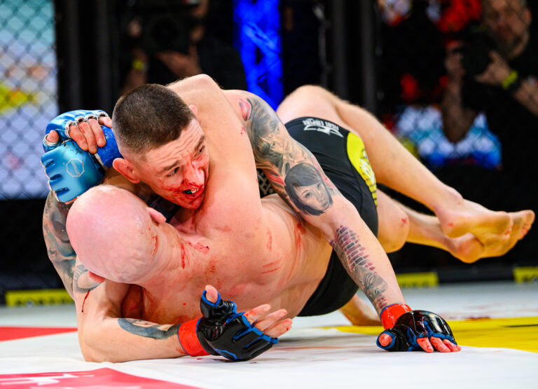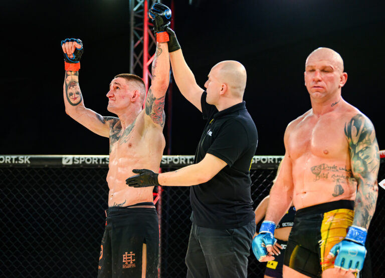 Vojto Barborík zo Slovenska (hore) a Adrian Kepa z Polska (dole) z kategórie MMA - 70kg počas turnaja zmiešaného bojového umenia MMA a bojového umenia Muaythai - Professional Muaythai League 13 v Hlohovci. Hlohovec, 25. január 2025. Foto: SITA/Martin Havran