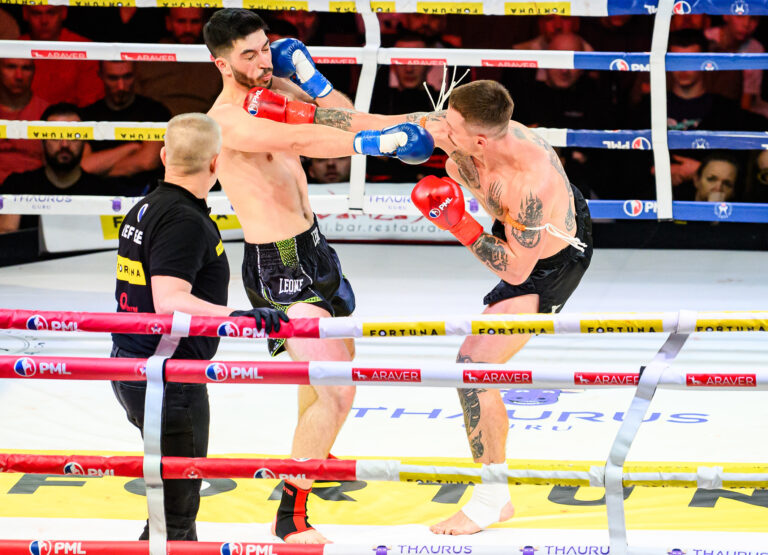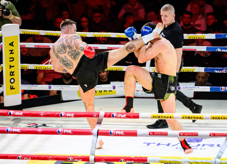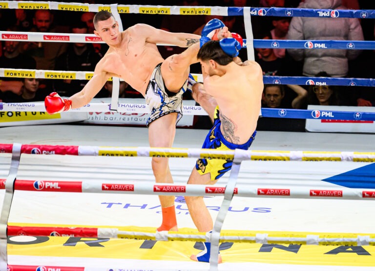 Juraj Tutura zo Slovenska (vpravo) z kategórie Muaythai - 85kg počas turnaja zmiešaného bojového umenia MMA a bojového umenia Muaythai - Professional Muaythai League 13 v Hlohovci. Hlohovec, 25. január 2025. Foto: SITA/Martin Havran