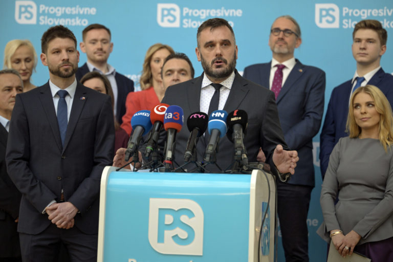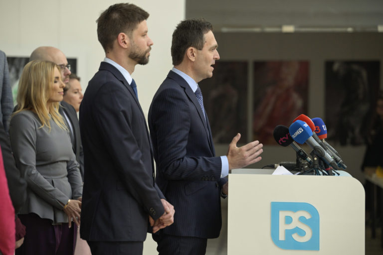Zľava v popredí: Predseda PS Michal Šimečka a kandidát vo voľbách do europarlamentu bývalý predseda vlády SR, ekonóm a vysokoškolský pedagóg Ľudovít Ódor počas predstavenia kompletnej kandidátky hnutia Progresívne Slovensko (PS) do volieb do Európskeho parlamentu (EP). Bratislava, 6. marec 2024. Foto: Archívne, SITA/Milan Illík.