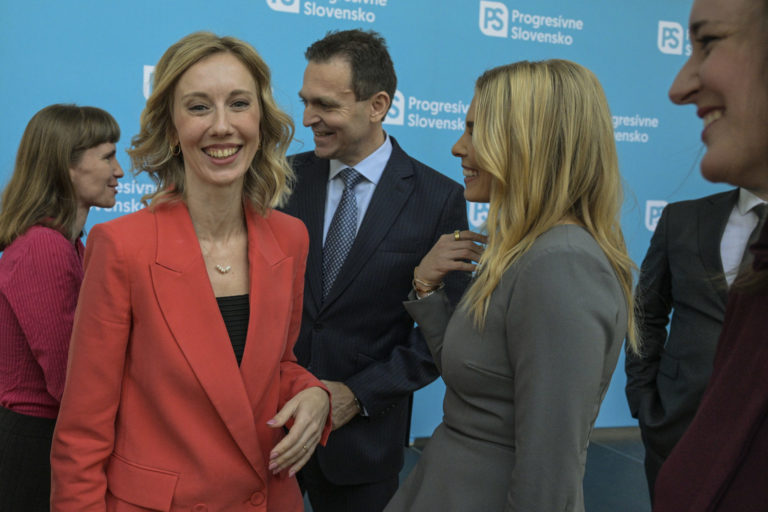 Zľava v popredí: Predseda PS Michal Šimečka a kandidátka vo voľbách do europarlamentu, expertka na európsku politiku Lucia Yar počas predstavenia kompletnej kandidátky hnutia Progresívne Slovensko (PS) do volieb do Európskeho parlamentu (EP). Bratislava, 6. marec 2024. Foto: archívne, SITA/Milan Illík.