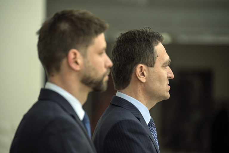 Zľava: Predseda PS Michal Šimečka a kandidát vo voľbách do europarlamentu bývalý predseda vlády SR, ekonóm a vysokoškolský pedagóg Ľudovít Ódor počas predstavenia kompletnej kandidátky hnutia Progresívne Slovensko (PS) do volieb do Európskeho parlamentu (EP). Bratislava, 6. marec 2024. Foto: SITA/Milan Illík.