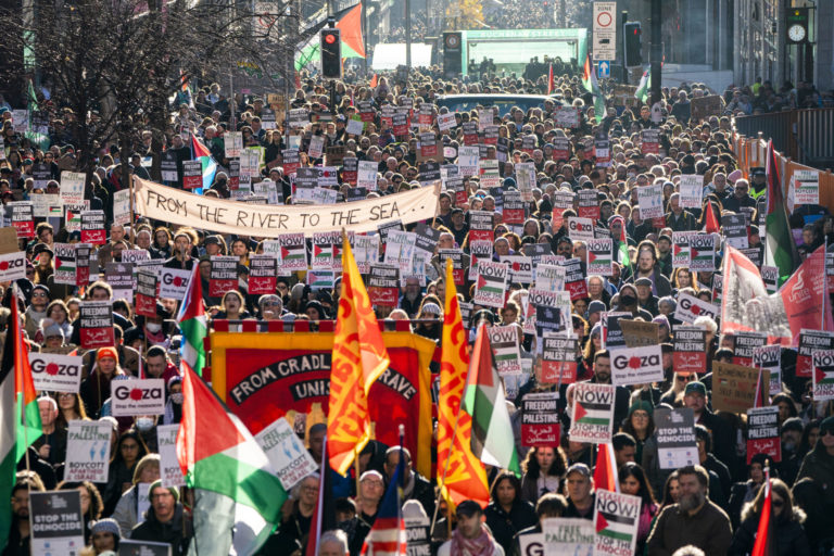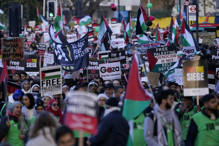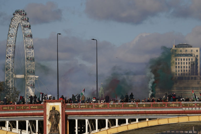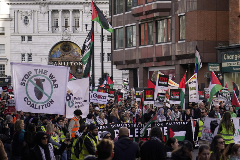 Propalestínsky protest v Londýne, Londýnska polícia zvýšila úsilie, aby zabezpečila, že propalestínsky pochod zostane pokojný po týždni politických sporov. Foto: SITA/AP