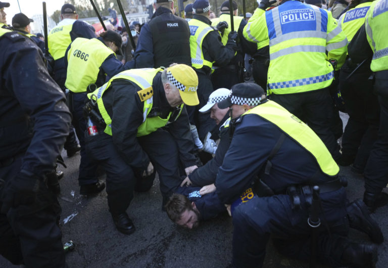 Protestujúci je zadržaný políciou na Parlamentnom námestí počas propalestínskeho protestného pochodu z Hyde Parku k veľvyslanectvu USA vo Vauxhall v Londýne. Foto: Jeff Moore/PA via AP