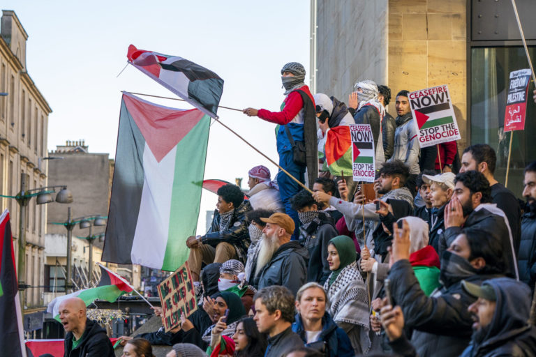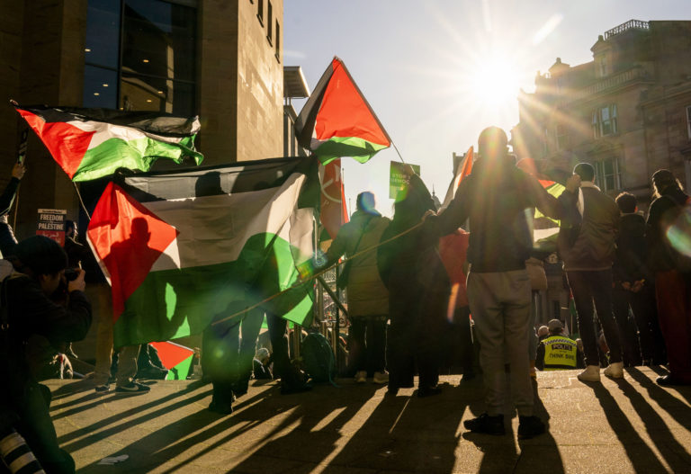 Ľudia na propalestínskej demonštrácii v škótskom Glasgowe. Foto: Jane Barlow/PA via AP
