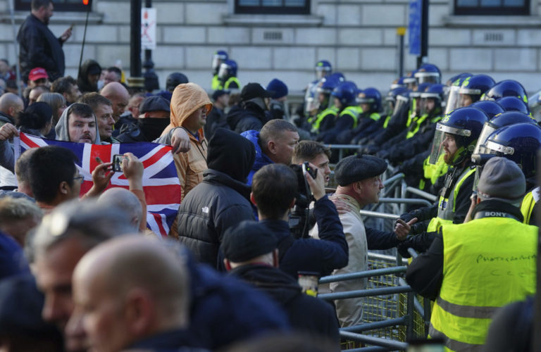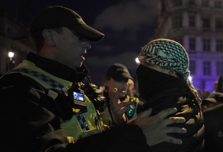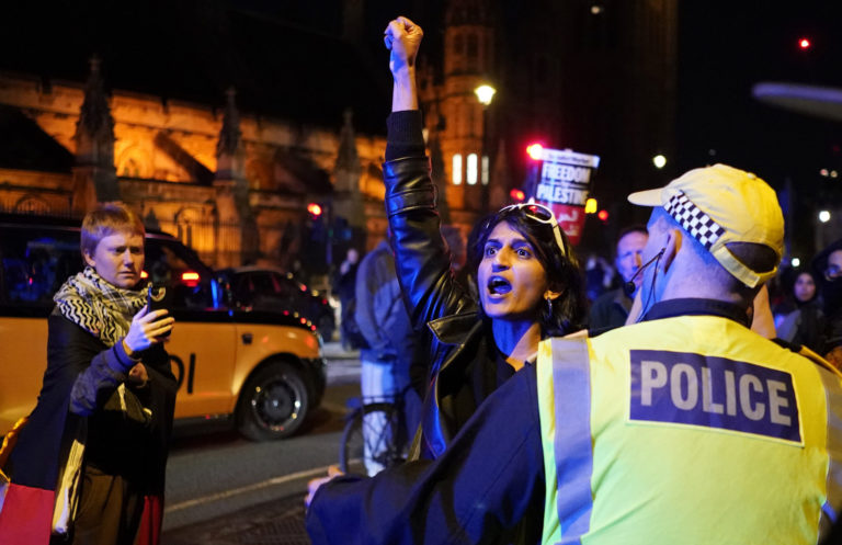Protestujúci a polícia sa radia na Parlamentnom námestí počas propalestínskeho protestného pochodu. Foto: Victoria Jones/PA via AP