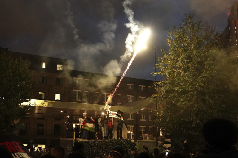 Ľudia odpaľujú ohňostroje počas propalestínskeho protestu, ktorý smeruje z Hyde Parku k veľvyslanectvu USA vo Vauxhall v Londýne. Foto: Aaron Chown/PA via AP