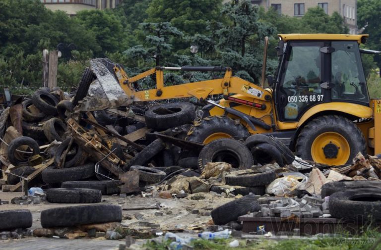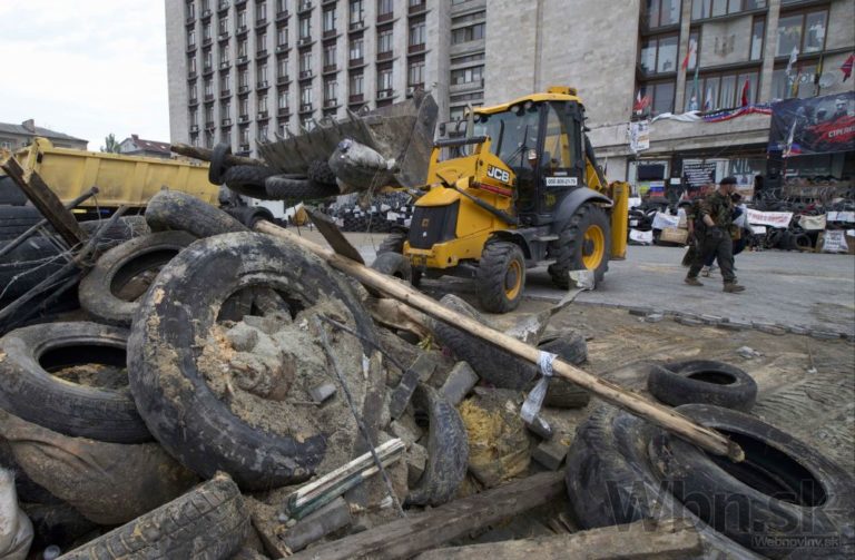 Pracovníci odstraňujú barikádu spred administratívnej budovy v Donecku. Proruskí separatisti zostrelili vo štvrtok na východe Ukrajiny vládny vojenský vrtuľník. Incident si vyžiadal životy celej posádky. Foto: SITA/AP