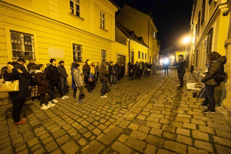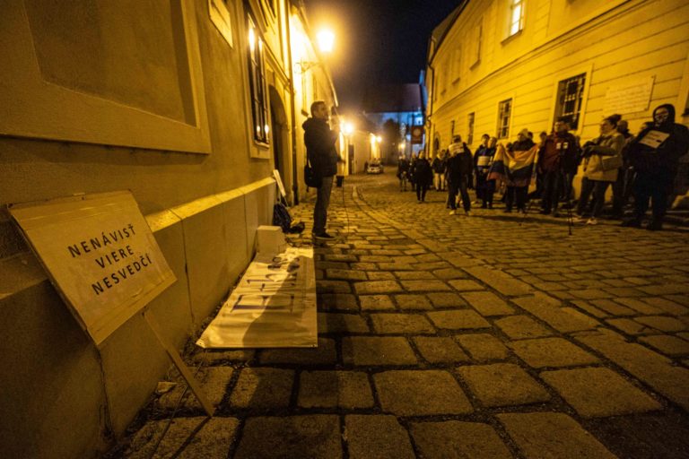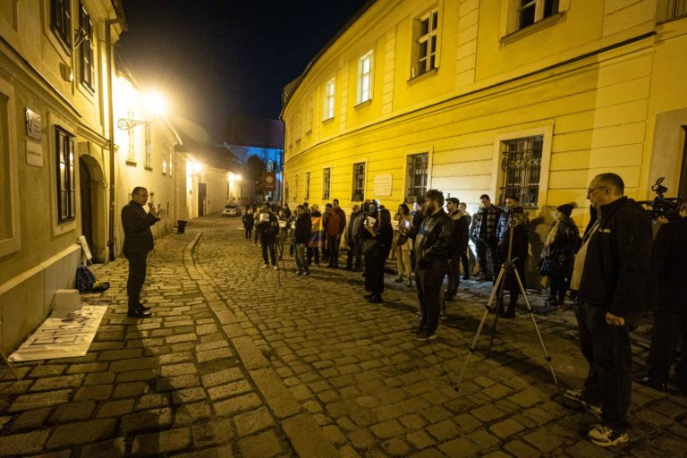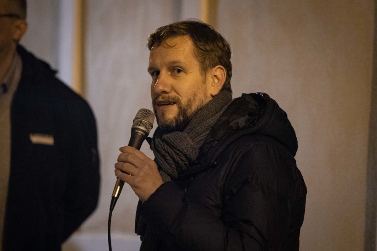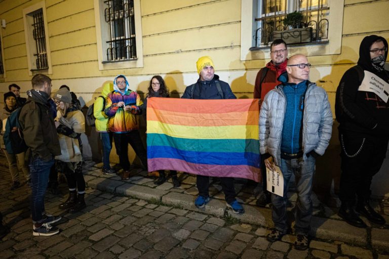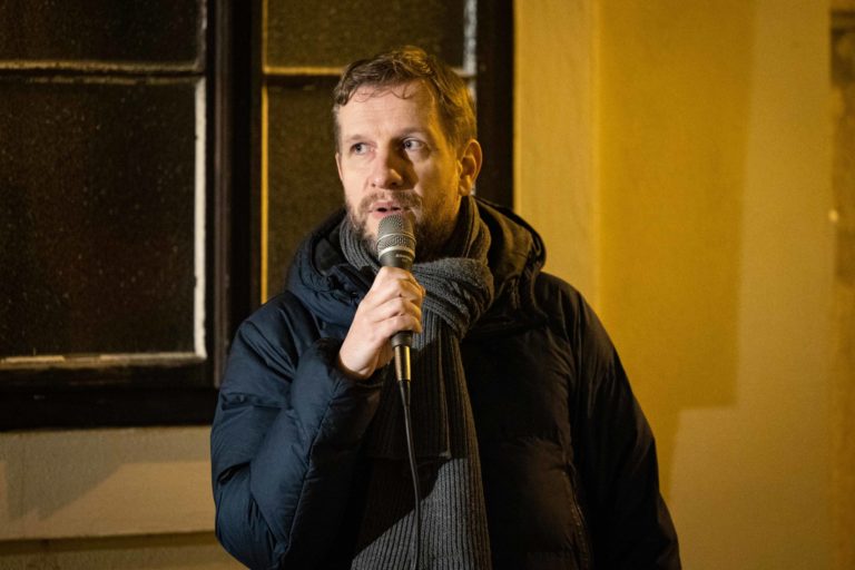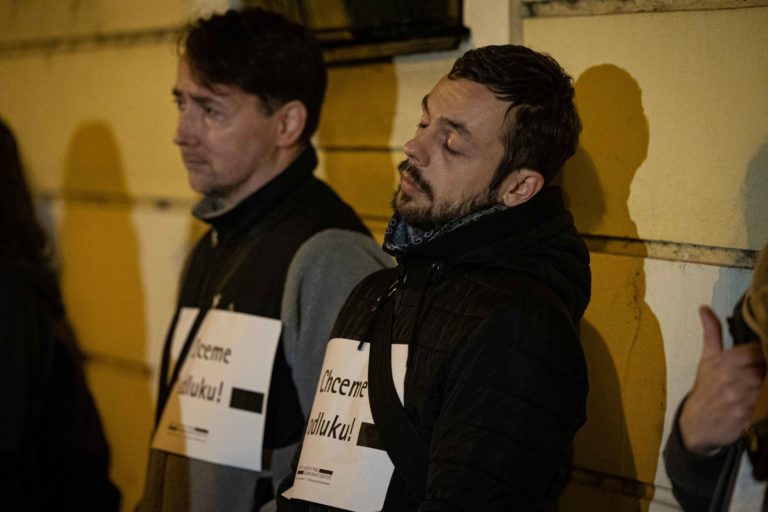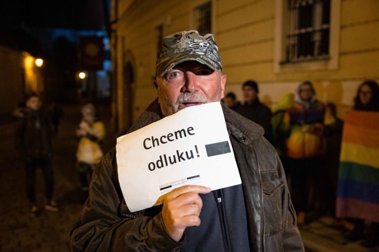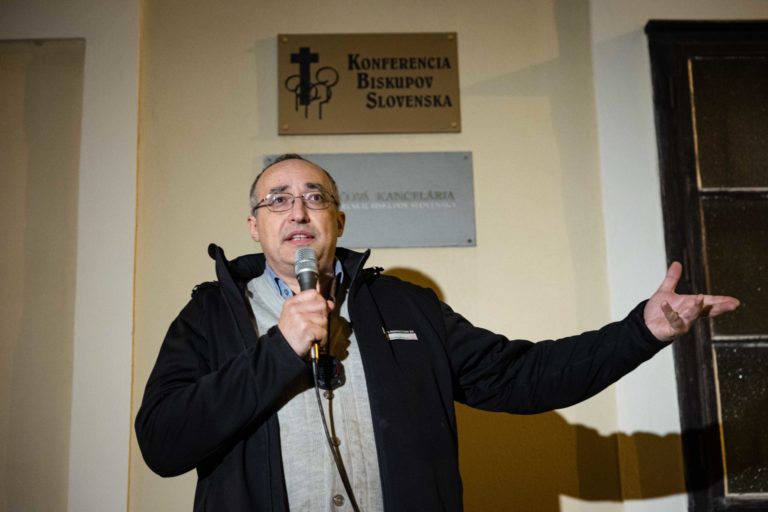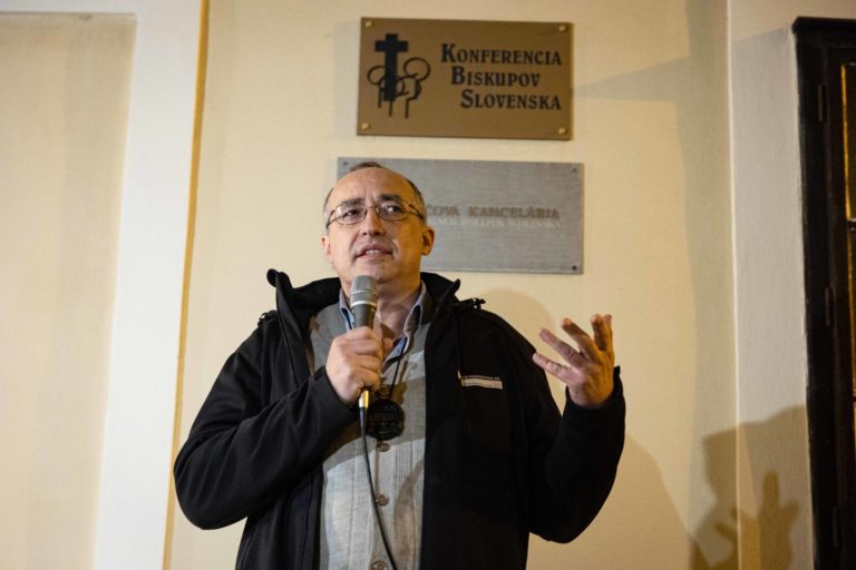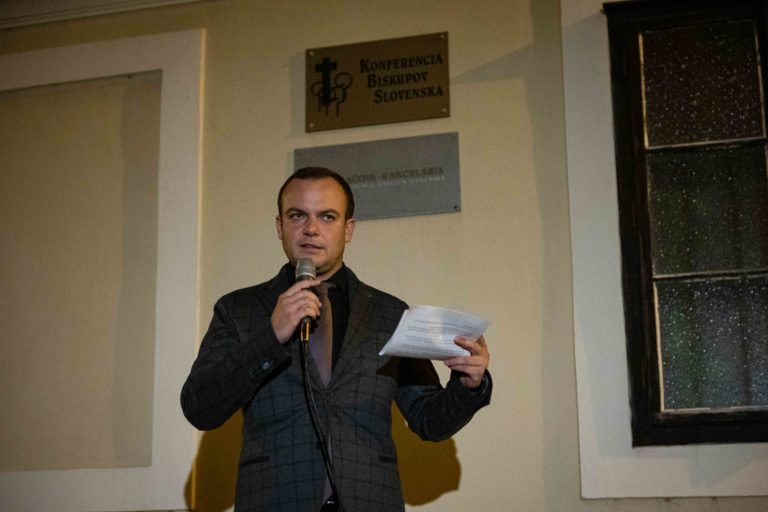 Výkonný riaditeľ Inštitútu ľudských práv Peter Weisenbacher počas protestu Chceme odluku od Oroscha! organizovaného Inštitútom ľudských práv a združením Ethos pred sídlom Konferencie biskupov Slovenska. Bratislava, 10. november 2022. Foto: SITA/Jana Birošová