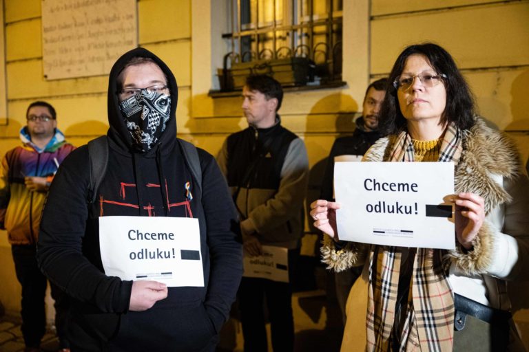 Účastníci protestu Chceme odluku od Oroscha! organizovaného Inštitútom ľudských práv a združením Ethos pred sídlom Konferencie biskupov Slovenska. Bratislava, 10. november 2022. Foto: SITA/Jana Birošová