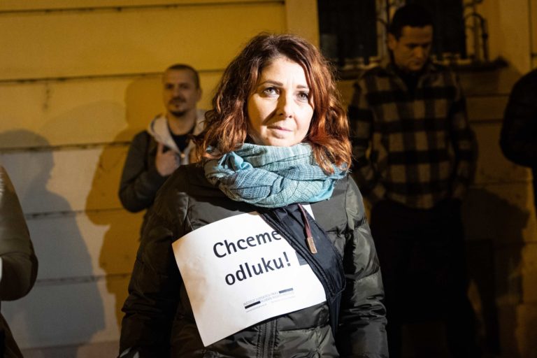 Jedna z organizátorov protestu Chceme odluku od Oroscha! organizovaného Inštitútom ľudských práv a združením Ethos pred sídlom Konferencie biskupov Slovenska. Bratislava, 10. november 2022. Foto: SITA/Jana Birošová