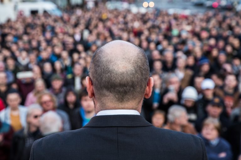 Predseda strany Sloboda a Solidarita (SaS) Richard Sulík (chrbtom) počas stretnutia voličov opozície s opozičnými poslancami na Námestí SNP. Cieľom stretnutia bolo odovzdať jasný odkaz kauzami sprofanovanej vláde s výzvou Budeme vás sledovať. Bratislava, 18. marec 2016. Foto: SITA/Marko Erd