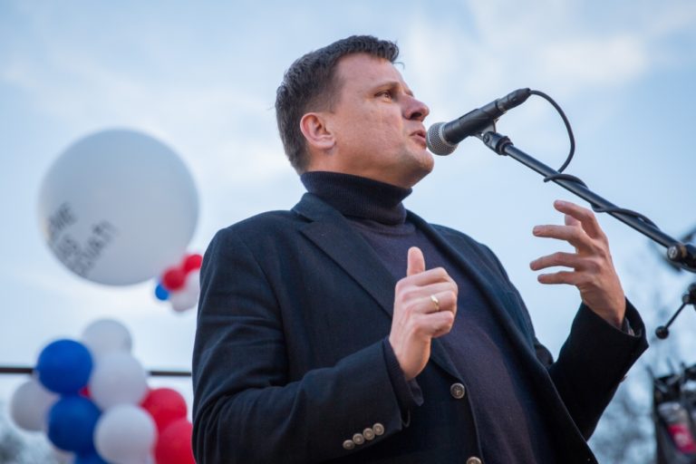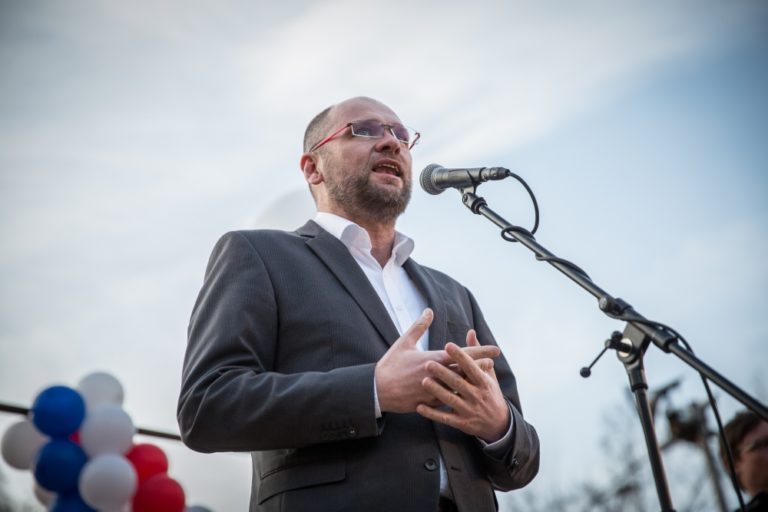 Predseda strany Sloboda a Solidarita (SaS) Richard Sulík počas stretnutia voličov opozície s opozičnými poslancami na Námestí SNP. Cieľom stretnutia bolo odovzdať jasný odkaz kauzami sprofanovanej vláde s výzvou Budeme vás sledovať. Bratislava, 18. marec 2016. Foto: SITA/Marko Erd