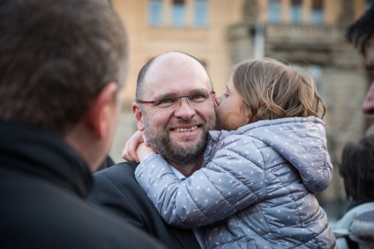 Umelec Peter Horváth počas stretnutia voličov opozície s opozičnými poslancami na Námestí SNP. Cieľom stretnutia bolo odovzdať jasný odkaz kauzami sprofanovanej vláde s výzvou Budeme vás sledovať. Bratislava, 18. marec 2016. Foto: SITA/Marko Erd