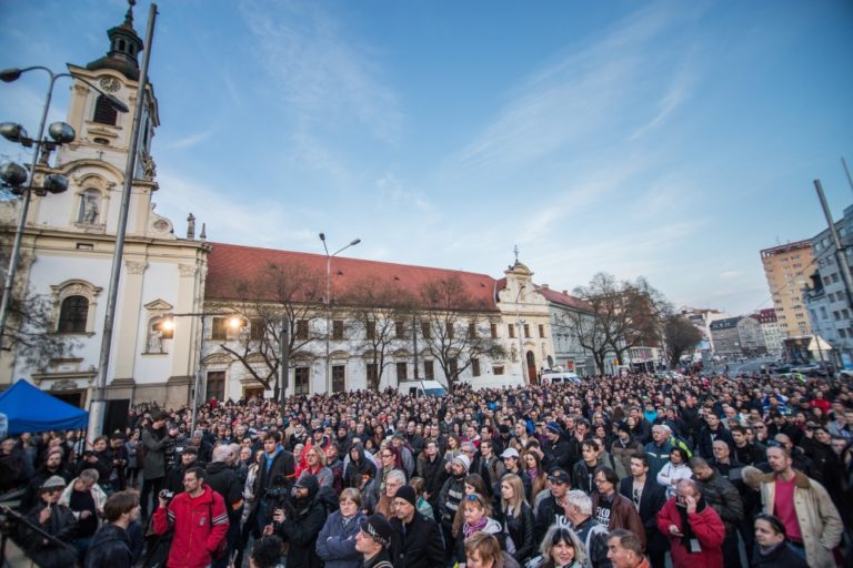 Atmosféra počas stretnutia voličov opozície s opozičnými poslancami na Námestí SNP. Cieľom stretnutia bolo odovzdať jasný odkaz kauzami sprofanovanej vláde s výzvou Budeme vás sledovať. Bratislava, 18. marec 2016. Foto: SITA/Marko Erd