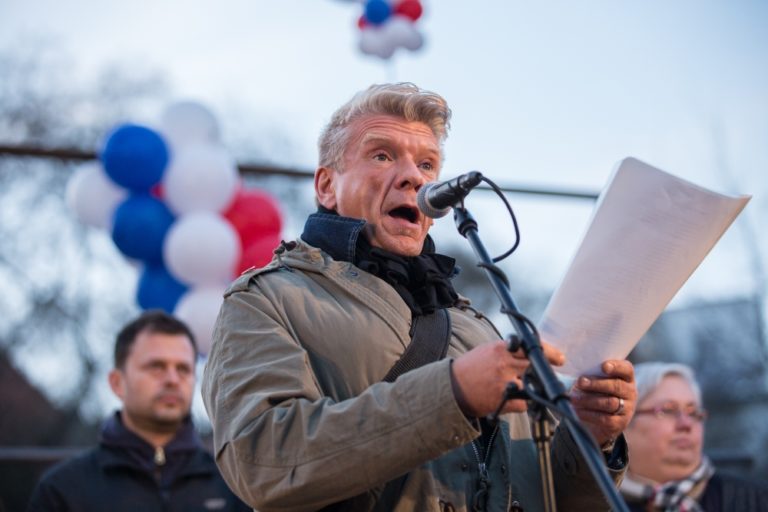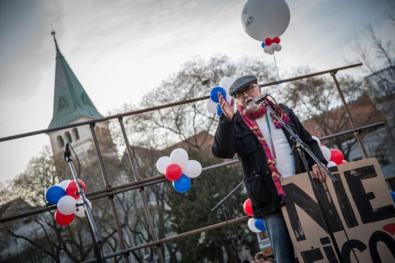 Herec Richard Stanke počas stretnutia voličov opozície s opozičnými poslancami na Námestí SNP. Cieľom stretnutia bolo odovzdať jasný odkaz kauzami sprofanovanej vláde s výzvou Budeme vás sledovať. Bratislava, 18. marec 2016. Foto: SITA/Marko Erd