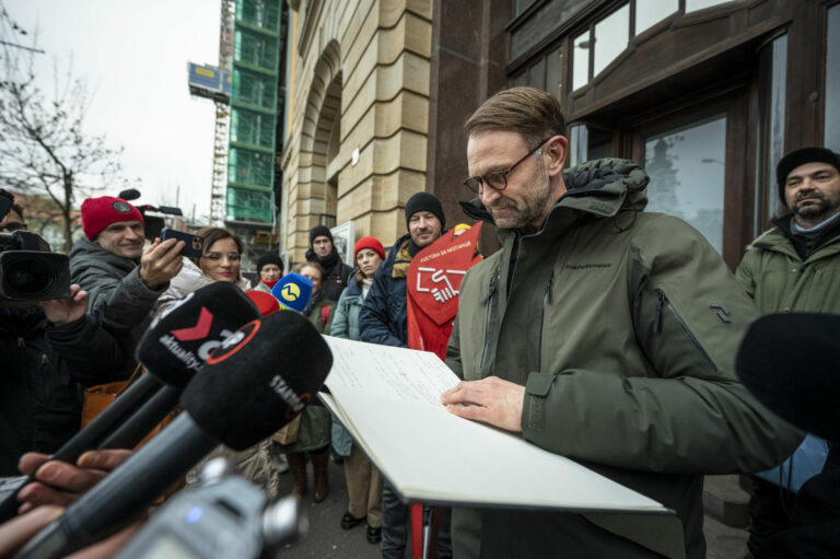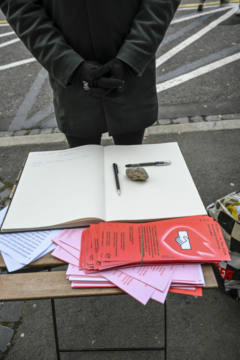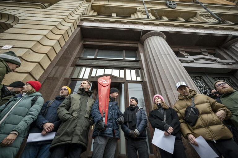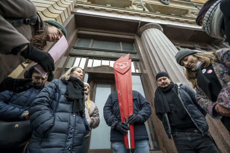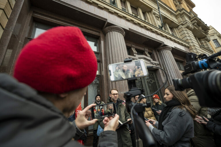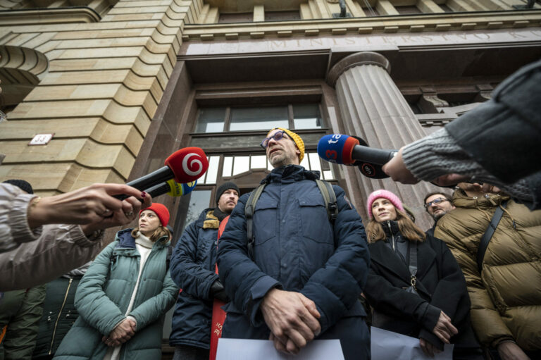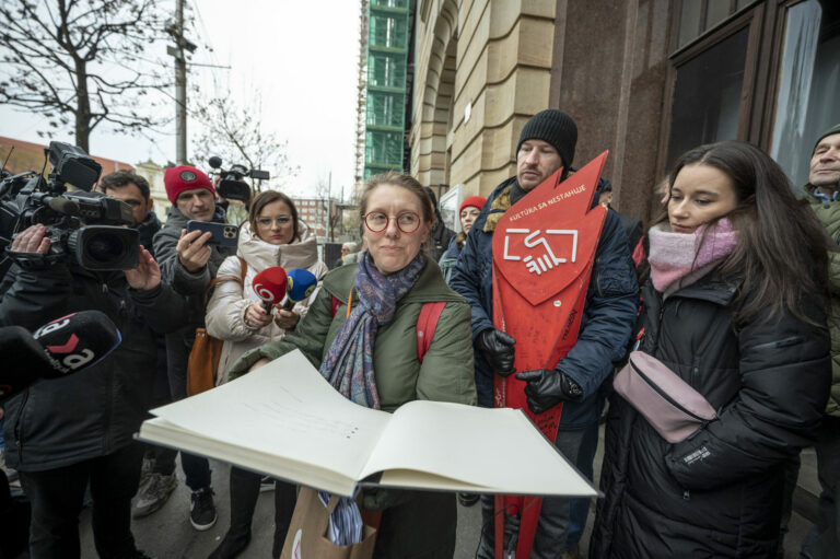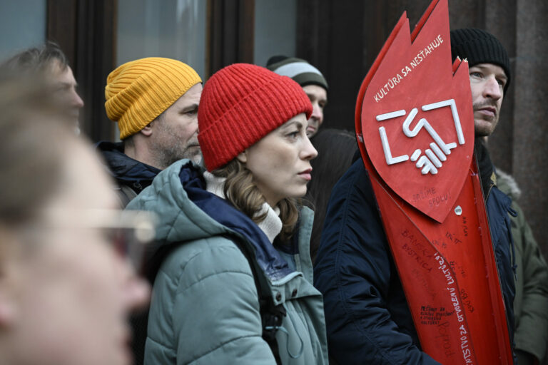Atmosféra počas brífingu členov Činohry Slovenského národného divadla (SND) k štafetovému protestu Slovenská kultúrna pochodeň pred Ministerstvom kultúry na Námestí SNP v Bratislave. Bratislava, 12. december 2024. Foto: SITA/Milan Illík