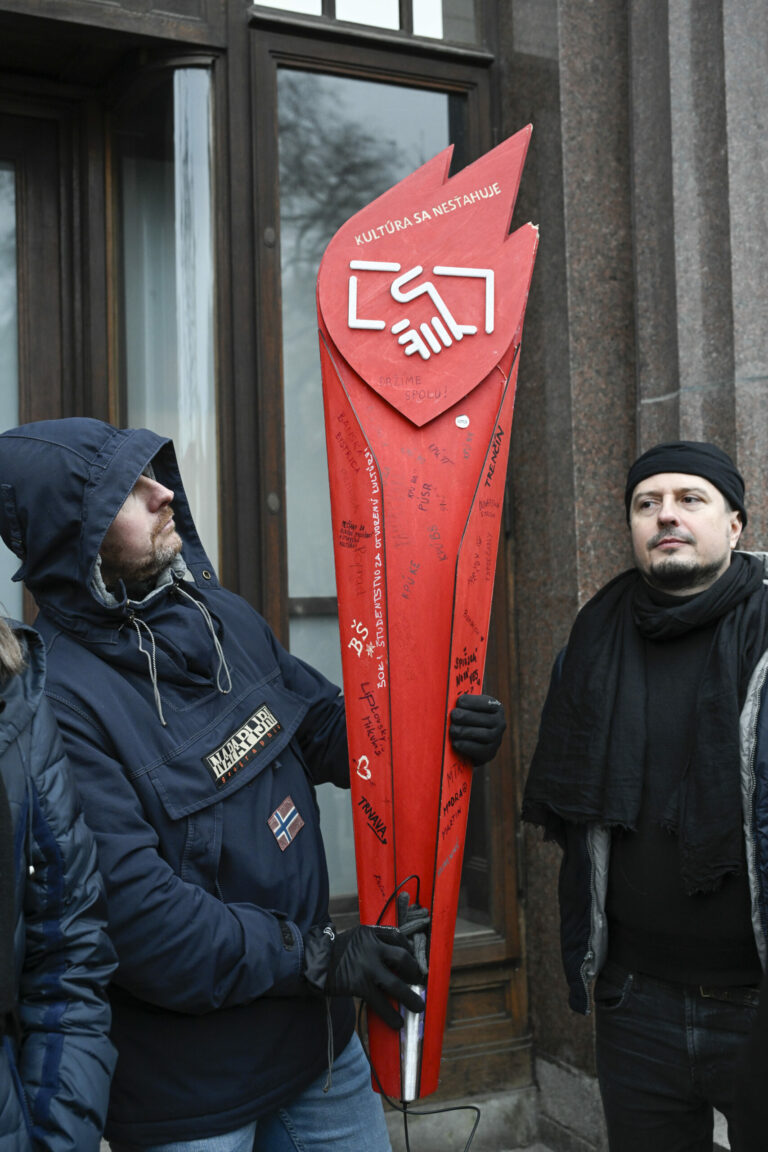 Pochodeň (vpravo), ktorá putovala od 17. novembra - 12. decembra 2024 z Humenného do Bratislavy počas brífingu členov Činohry Slovenského národného divadla (SND) k štafetovému protestu Slovenská kultúrna pochodeň pred Ministerstvom kultúry na Námestí SNP v Bratislave. Bratislava, 12. december 2024. Foto: SITA/Milan Illík