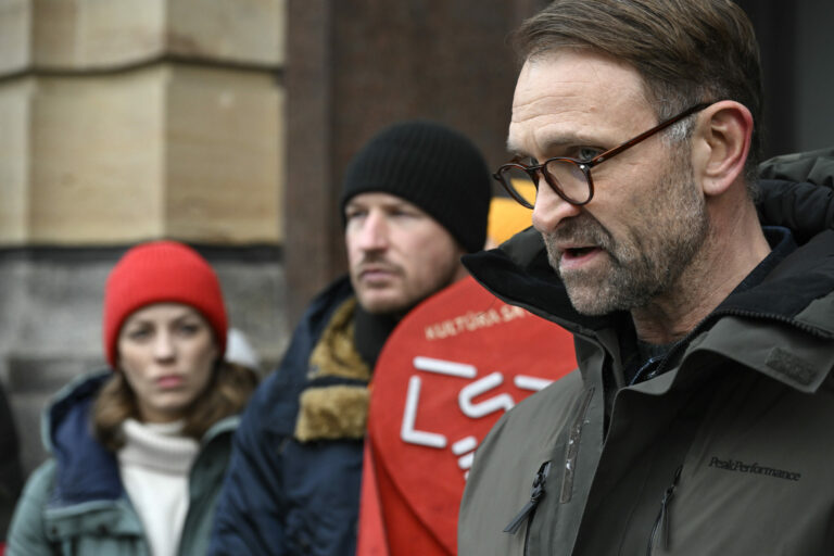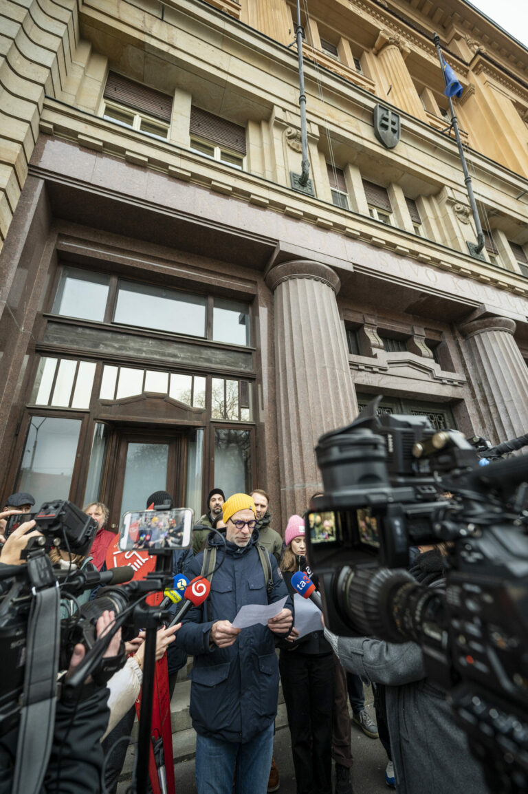 Herec Ondrej Kovaľ (v popredí) počas brífingu členov Činohry Slovenského národného divadla (SND) k štafetovému protestu Slovenská kultúrna pochodeň pred Ministerstvom kultúry na Námestí SNP v Bratislave. Bratislava, 12. december 2024. Foto: SITA/Milan Illík