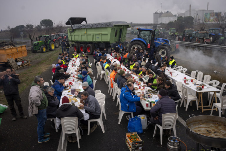 Farmári spolu sedia na obede po zablokovaní diaľnice počas protestu neďaleko Mollerussa na severovýchode Španielska, utorok 6. februára 2024. Foto: SITA/AP
