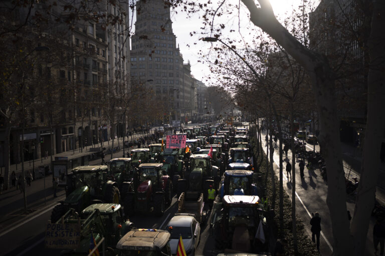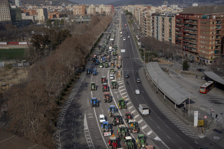 Farmári jazdia na svojich traktoroch počas protestu v Barcelone, Španielsko, v stredu 7. februára 2024. Foto: SITA/AP