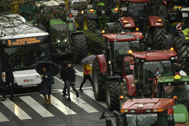 Chodci prechádzajú cez cestu, zatiaľ čo farmári so svojimi traktormi prechádzajú stredom mesta, pričom sa zúčastňujú protestu v Pamplone v severnom Španielsku vo štvrtok 8. februára 2024. Foto: SITA/AP