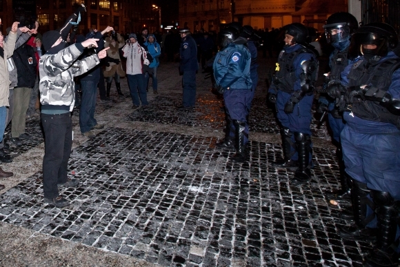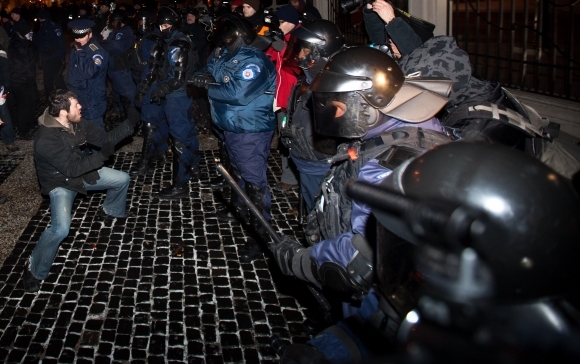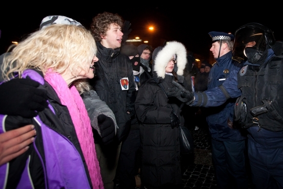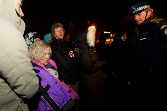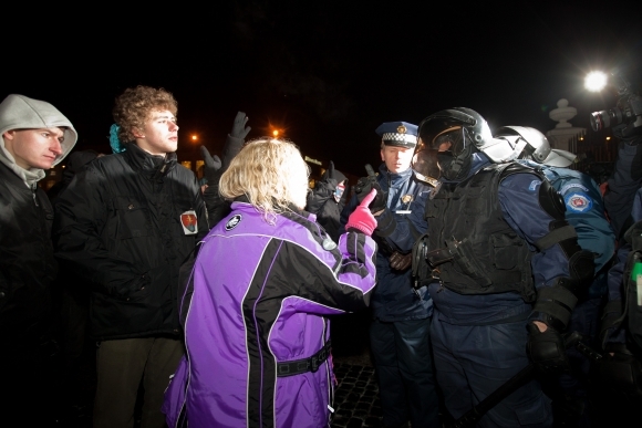 Novinár Tom Nicholson počas protestu Gorila - 3. v Bratislave. Bratislava, 10. február 2012. Foto: SITA/Jozef Jakubčo