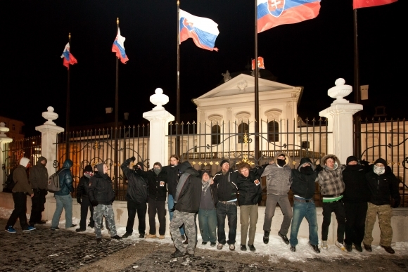 Účastníci protestu Gorila - 3. v Bratislave pred Prezidentským palácom. Bratislava, 10. február 2012. Foto: SITA/Diana Černáková