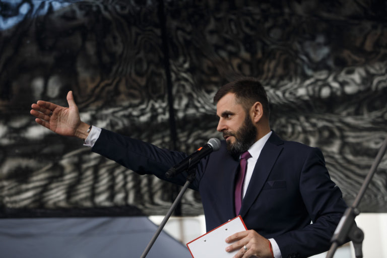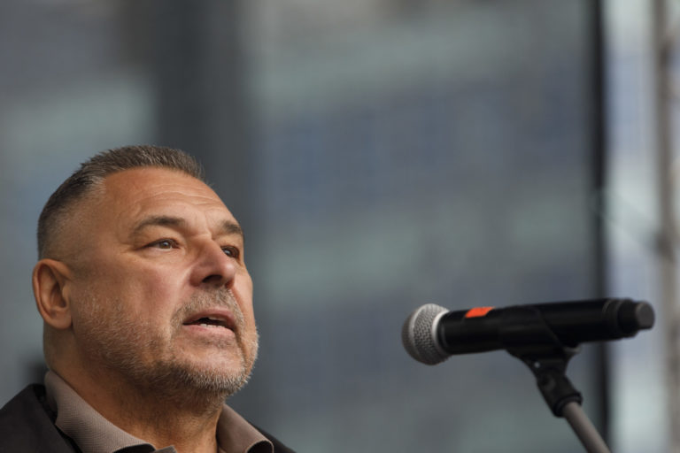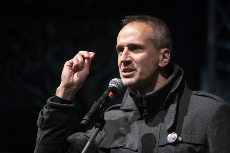 bývalý člen strany Reublika Peter Marček počas protivládneho protestu za predčasné voľby a za efektívny boj so zdražovaním, ktorý organizovala strana Smer - sociálna demokracia pred Prezidentským palácom. Bratislava, 20. september 2022. Foto: archívne, SITA/Branislav Bibel