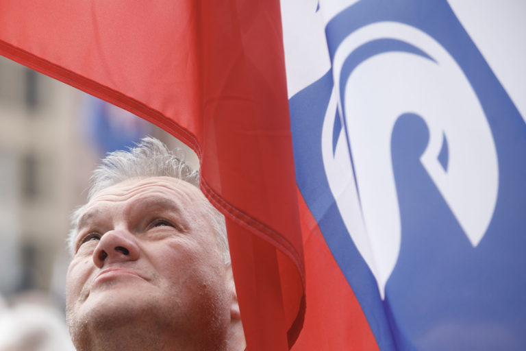 Účastník s vlajkou strany Slovenská národná strana (SNS) počas protivládneho protestu za predčasné voľby a za efektívny boj so zdražovaním, ktorý organizovala strana Smer - sociálna demokracia pred Prezidentským palácom. Bratislava, 20. september 2022. Foto: SITA/Branislav Bibel