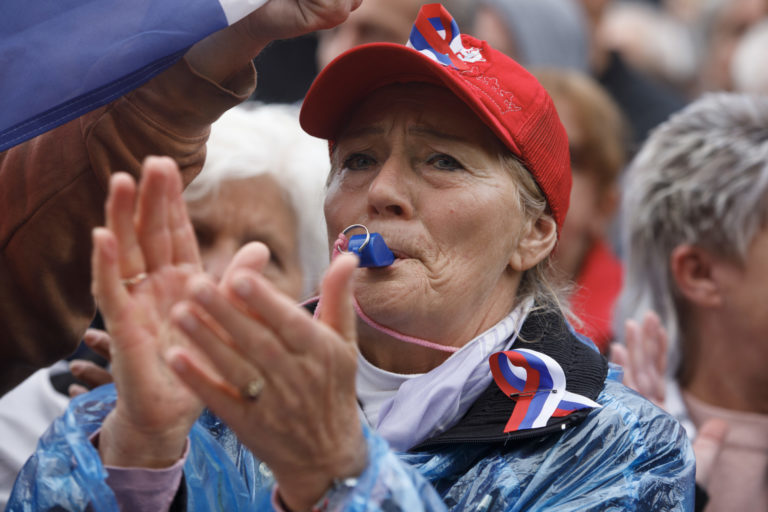 Účastníčky počas protivládneho protestu za predčasné voľby a za efektívny boj so zdražovaním, ktorý organizovala strana Smer - sociálna demokracia pred Prezidentským palácom. Bratislava, 20. september 2022. Foto: SITA/Branislav Bibel