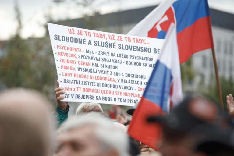 Účastníci s transparentami počas protivládneho protestu za predčasné voľby a za efektívny boj so zdražovaním, ktorý organizovala strana Smer - sociálna demokracia pred Prezidentským palácom. Bratislava, 20. september 2022. Foto: SITA/Branislav Bibel