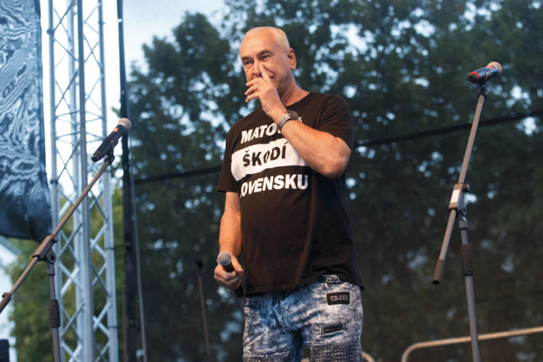 Spevák Marián Greksa počas protivládneho protestu za predčasné voľby a za efektívny boj so zdražovaním, ktorý organizovala strana Smer - sociálna demokracia pred Prezidentským palácom. Bratislava, 20. september 2022. Foto: SITA/Branislav Bibel