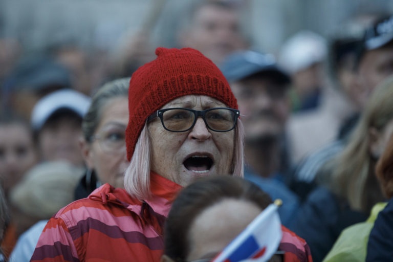 Účastníčka počas protivládneho protestu za predčasné voľby a za efektívny boj so zdražovaním, ktorý organizovala strana Smer - sociálna demokracia pred Prezidentským palácom. Bratislava, 20. september 2022. Foto: SITA/Branislav Bibel