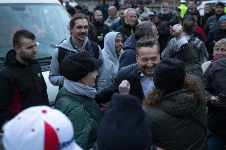 Podpredseda strany Smer-SD Ľuboš Blaha v dave počas protivládneho protestu za predčasné voľby a za efektívny boj so zdražovaním, ktorý organizovala strana Smer - sociálna demokracia pred Prezidentským palácom. Bratislava, 20. september 2022. Foto: SITA/Branislav Bibel